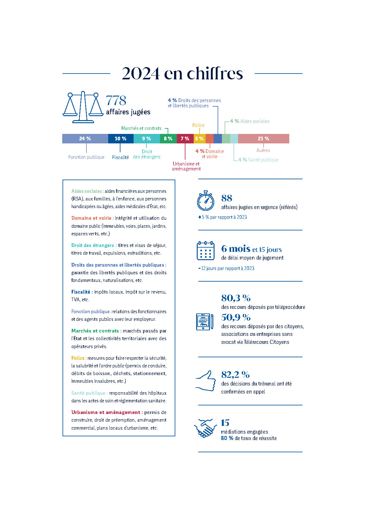 Le contentieux de la fonction publique représente plus d’un quart des affaires jugées, loin devant le contentieux fiscal, du droit des étrangers, des marchés publics et de l’urbanisme. Le nombre total de référés (147) est resté stable par rapport à 2023 et représente 18 % de l’activité des deux tribunaux. Par ailleurs, le taux de confirmation en appel des décisions rendues par la juridiction est de 82 %, ce qui est supérieur au taux national.